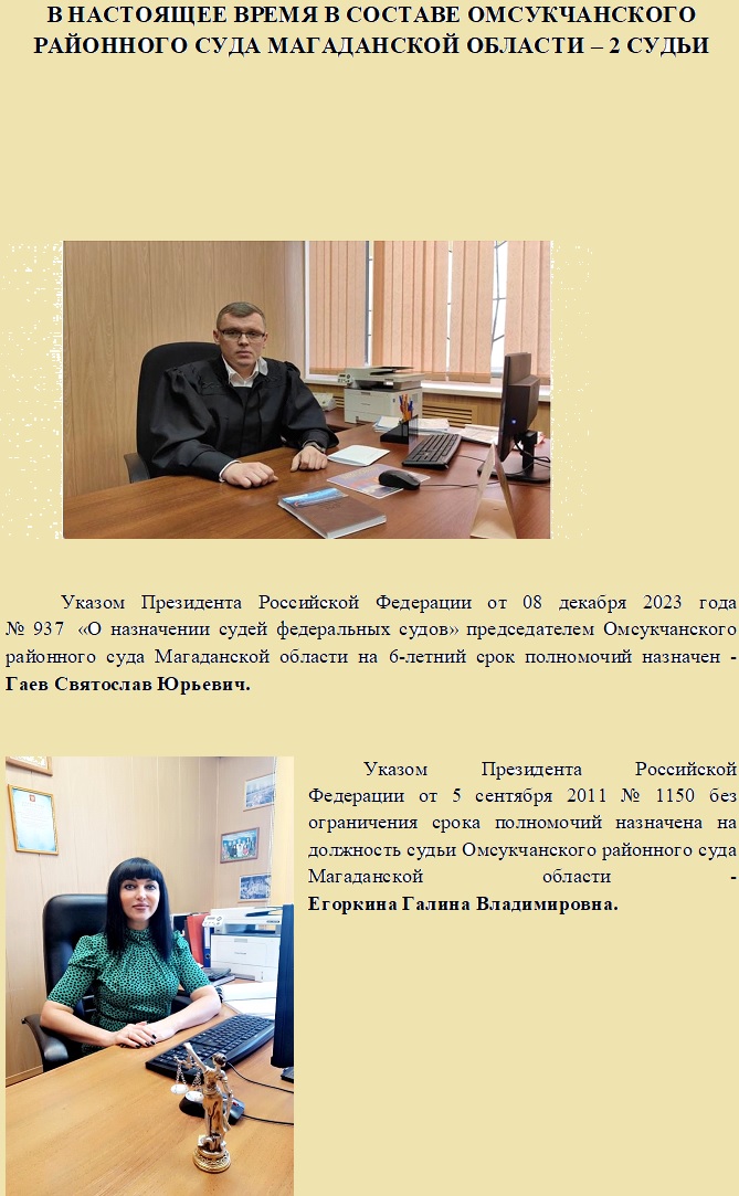 В НАСТОЯЩЕЕ ВРЕМЯ В СОСТАВЕ ОМСУКЧАНСКОГО РАЙОННОГО СУДА МАГАДАНСКОЙ ОБЛАСТИ – 2 СУДЬИ